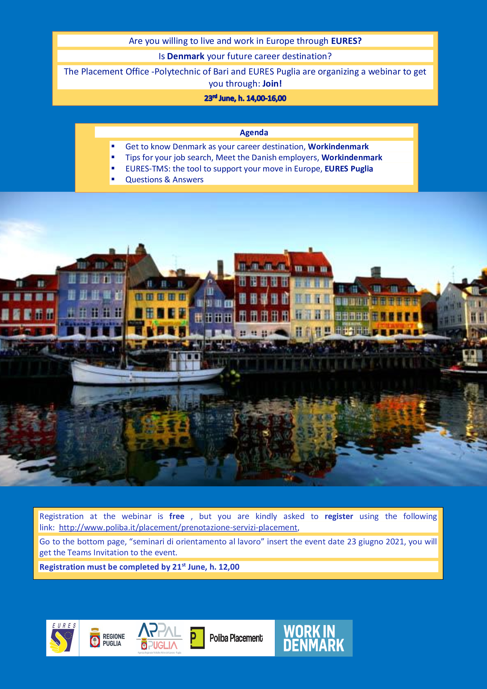 Interverranno i Servizi pubblici per l'impiego-EURES delle due regioni, EURES-VDAB per le Fiandre e WorkinDenmark per EURES-Danimarca che illustreranno le caratteristiche del loro mercato del lavoro, il posizionamento delle offerte disponibili, le top skills richieste.