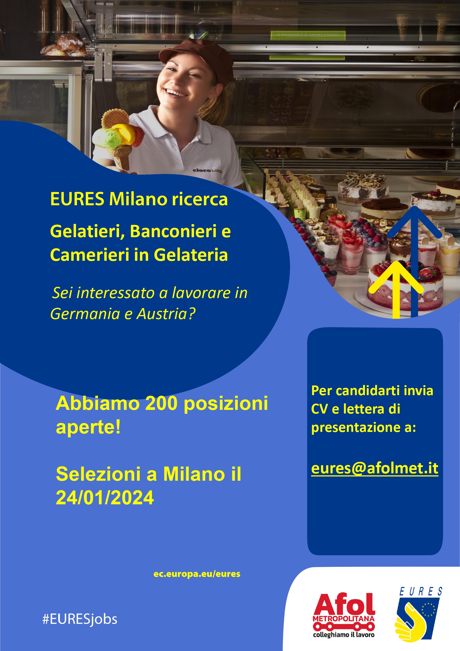 EURES Milano e l'agenzia Select cercano, per Germania e Austria, 200 gelatieri, banconieri e camerieri in gelaterie.